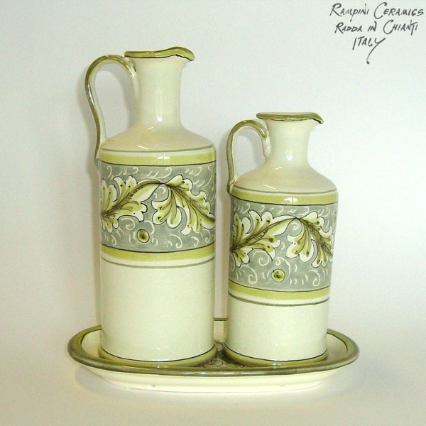 This is our suggestion for an oil and vinegar set. Two likeable bottles with a small handle, handmade in two different heights (normally the slightly taller one is used for oil) standing on a small tray that protects the table from the inevitable drips.