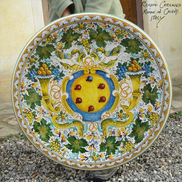 This type of round plate is often realized as an important piece for decorative use. Designs applied are often reproductions of old patterns, but always chosen to lend themselves to be laid out on such big pieces.